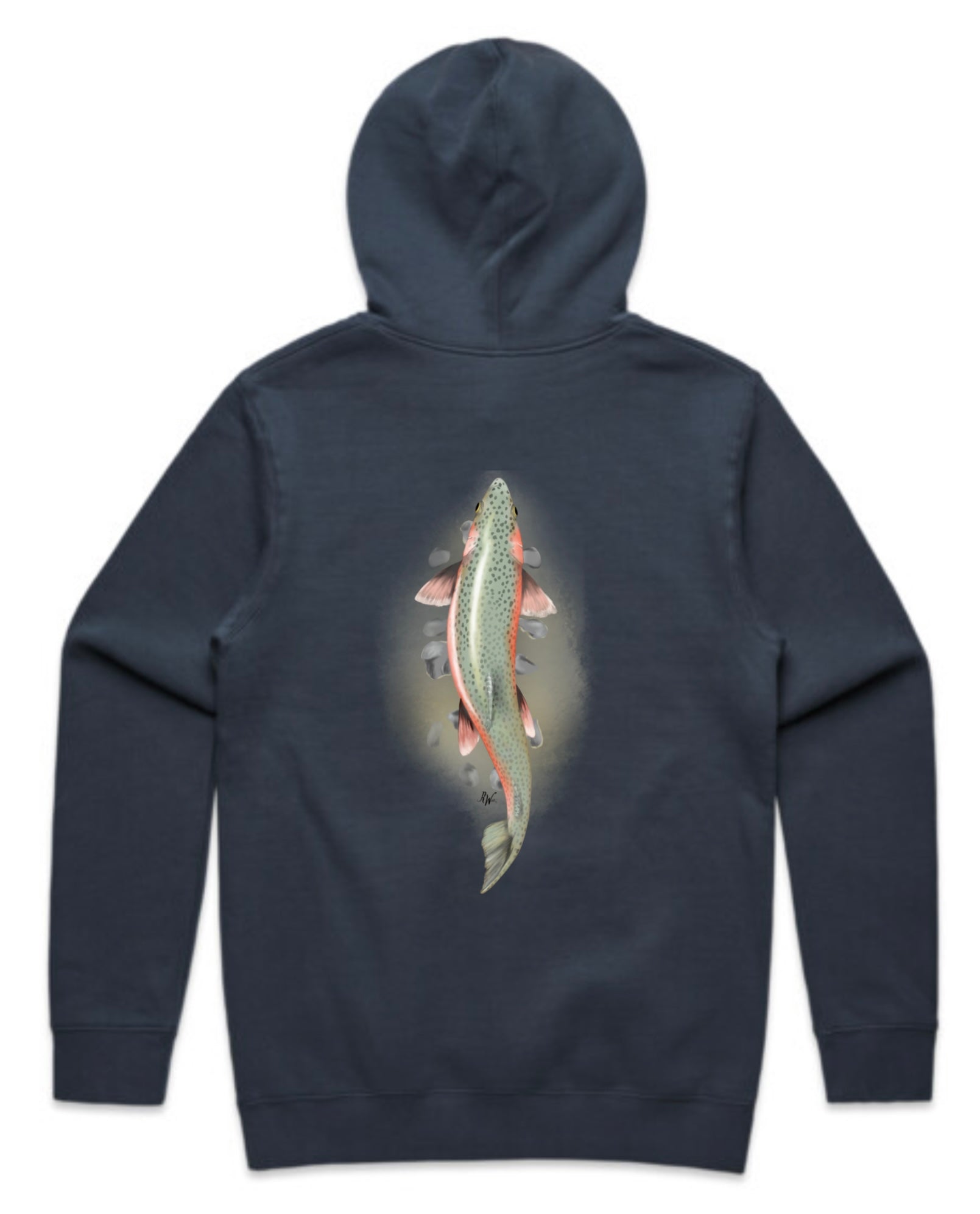 Introducing the Roaring Wild Nz Above Rainbow Trout with Rocks Hoodie is the perfect addition to your casual wardrobe. This stylish hoodie features our iconic Black and White Logo on dark colours or our Normal Logo on light colours (see photos above).