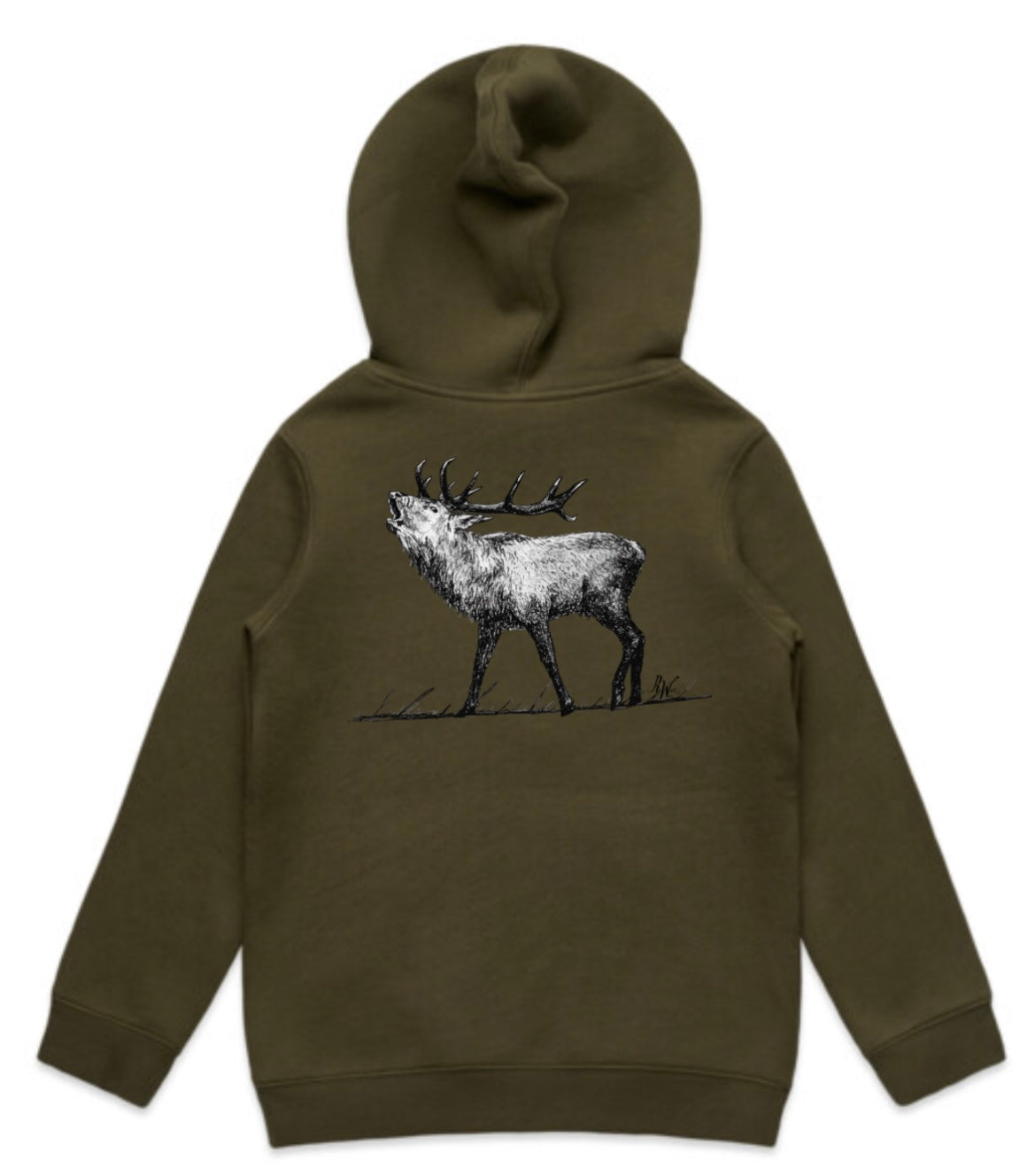 The Roaring Wild NZ Kids RR Red Stag Kids Hoodie, a original drawing done by Sammi Holland.