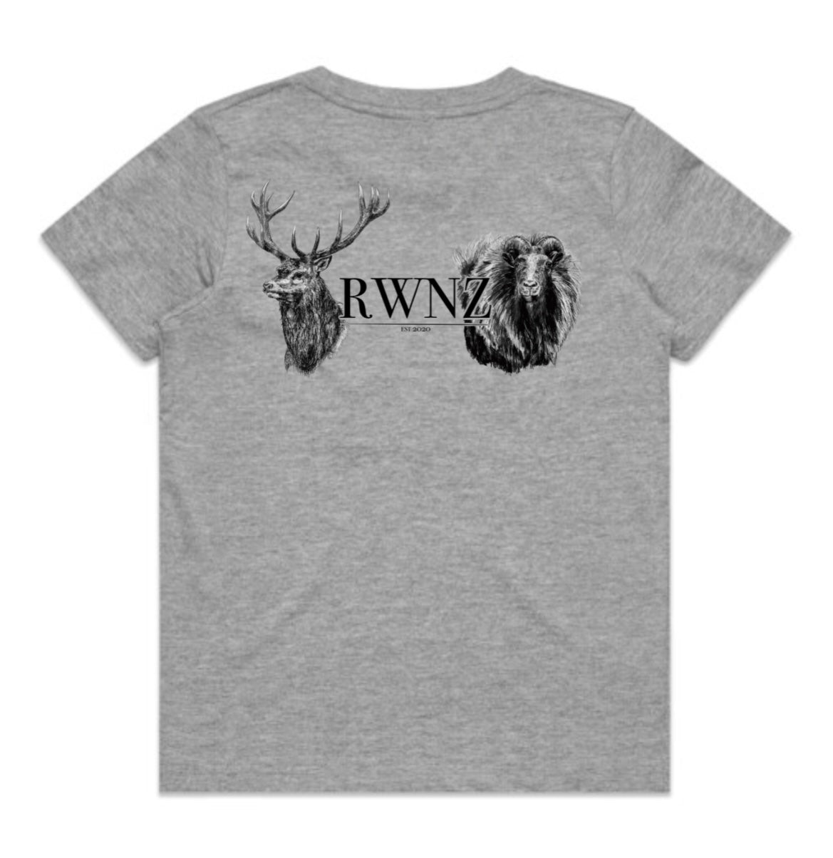 The Roaring Wild NZ Kids Stag and Bull Tahr Head Kids T-Shirt, a original drawing done by James Holland.